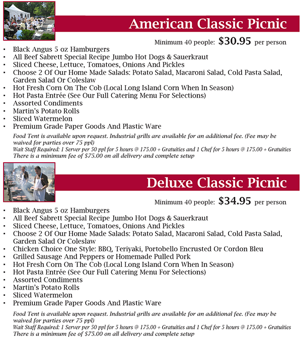 Over the past 25 years, Felico's Catering has gained an outstanding reputation as one of most trusted and valued Long Island caterers. Years of experience in catering both corporate and private BBQs in Suffolk and Nassau County, coupled with great food and impeccable service will make your BBQ an enjoyable and relaxing event. You get to be a guest at your own party while we take care of every detail - we come complete with everything you may need for your BBQ - custom food tents, commercial stainless steel grills and refrigerated vans to keep your food fresh and chefs and servers to attend to your every need.