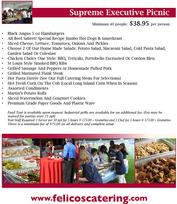What makes Felico's BBQ a special one? First of all, the quality of food we offer - 5 oz black angus burgers, Sabrett special recipe jumbo hot dogs, Martin's potato rolls, local fresh corn (when in season) and our famous home made salads. Our friendly staff and professional chef (included in all our BBQ packages) will make sure that you party runs smoothly and you can sit back, relax and enjoy the company of your friends and family. We have industrial grills and 10' food tents available upon request, and our professional party planners can help you with everything else you may need for your barbeque.