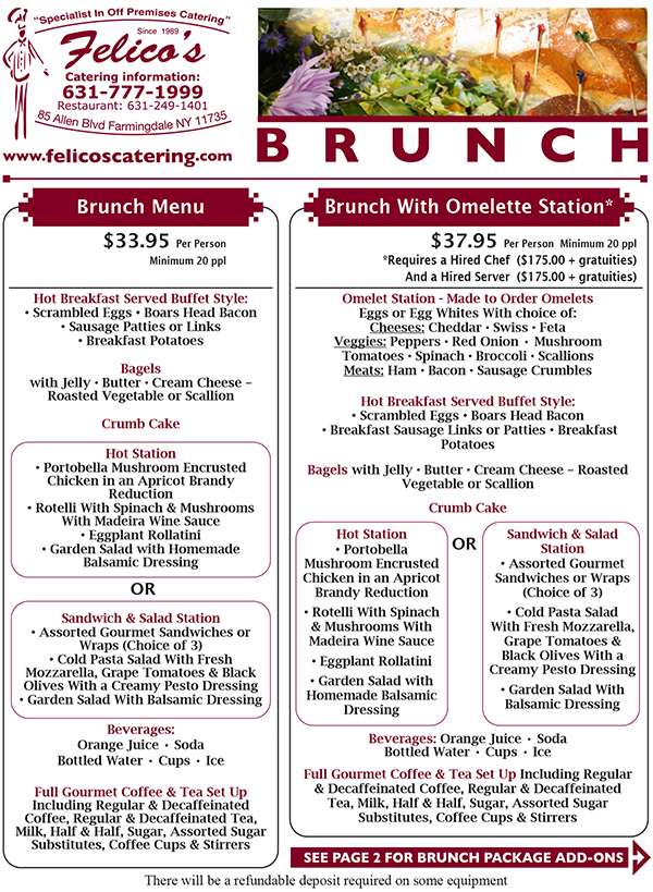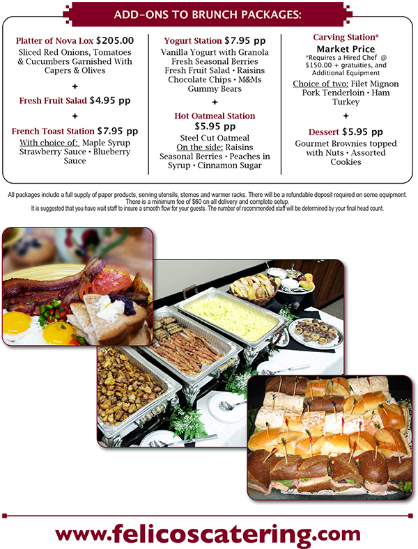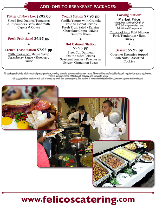 Felico's catered Brunch Menu combines traditional breakfast favorites with hearty lunch options, making it a perfect choice for a variety of catered events. Our wide range of choices lets you customize the menu to your needs and taste - your catering options include everything from our continental breakfast, hot breakfast buffets and omelette stations to gourmet sandwiches or wraps and hot lunch buffet. Pick healthy or indulgent - the choice is yours.