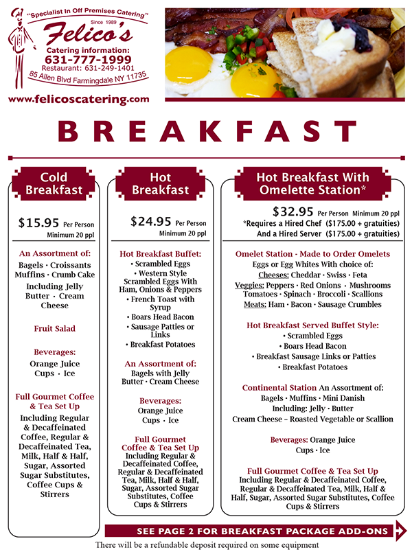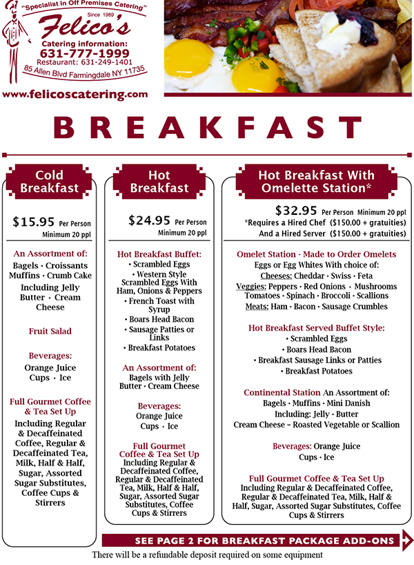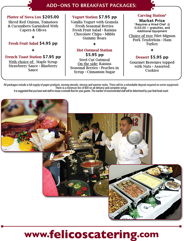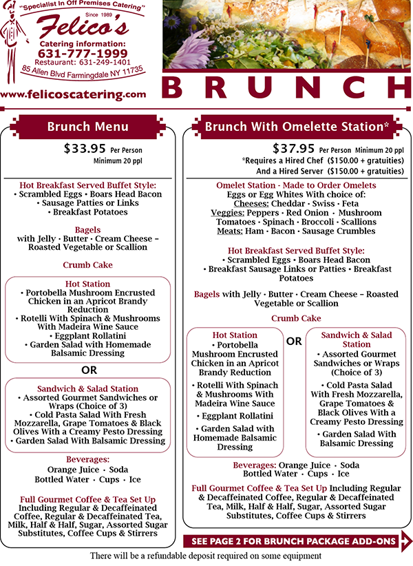 Felico's catered Brunch Menu combines traditional breakfast favorites with hearty lunch options, making it a perfect choice for a variety of catered events. Our wide range of choices lets you customize the menu to your needs and taste - your catering options include everything from our continental breakfast, hot breakfast buffets and omelette stations to gourmet sandwiches or wraps and hot lunch buffet. Pick healthy or indulgent - the choice is yours.