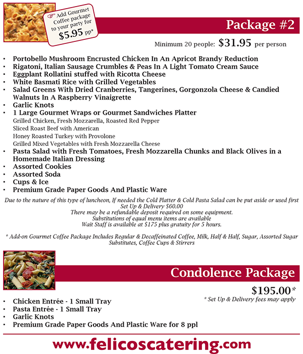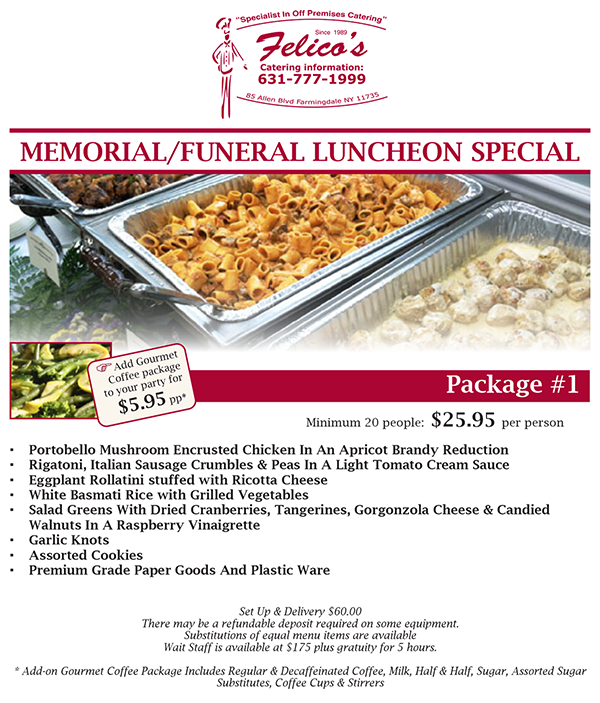 We respect and understand how difficult moving on in life can be without that special loved one by your side. At Felico's we try to make the transition as smooth as possible. With fourteen hot dishes available daily, we are here to take that last minute order in your time of mourning. We understand how overwhelming the process may be, and that is why our catering consultants are here to help. We are available any day, night or weekend to make what's important in your life, important to us.