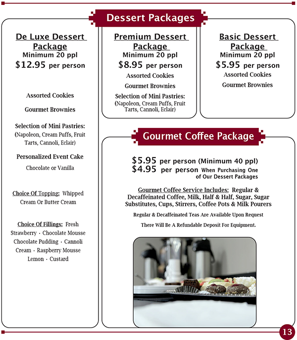 Sandwiches & Wraps | Desserts & Coffee | Beverage Packages