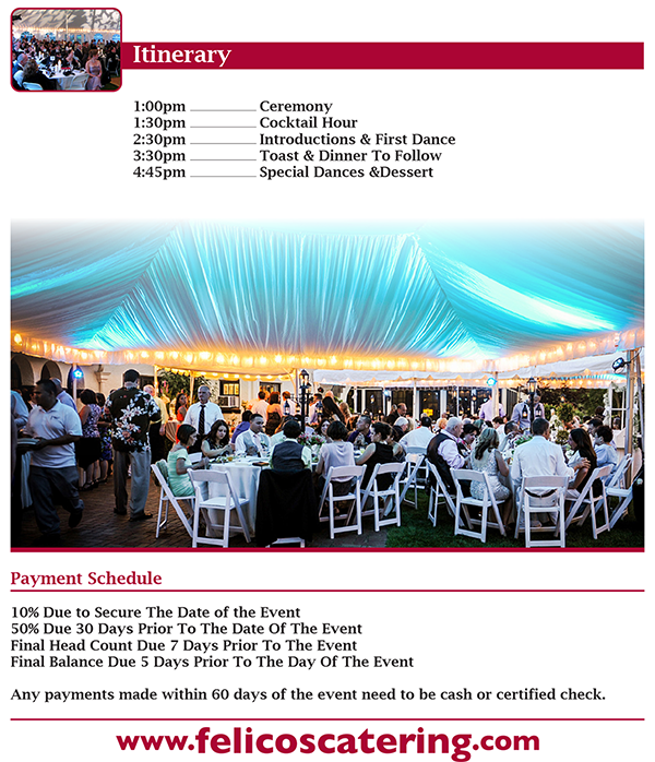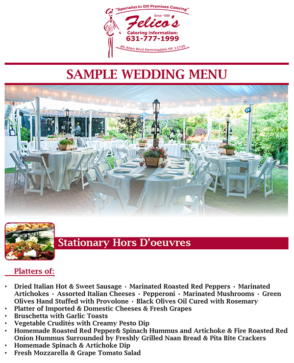 Felico's full service wedding catering with its central location in Farmingdale NY allows us to serve the whole Long Island and bring our delicious food to wherever you decide to celebrate your wedding day. Whether you want to have your dream wedding in Nassau or Suffolk county, our wedding planners and full staff of waitresses, waiters, bartenders, busboys and chefs, will be there to help you plan the perfect off site wedding. 25 years of experience of planning and executing weddings that go beyond traditional catering hall allows us to confidently say that we are the best choice for a wedding caterer in Nassau and Suffolk counties on Long Island.