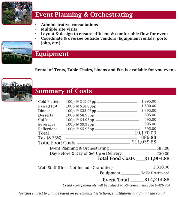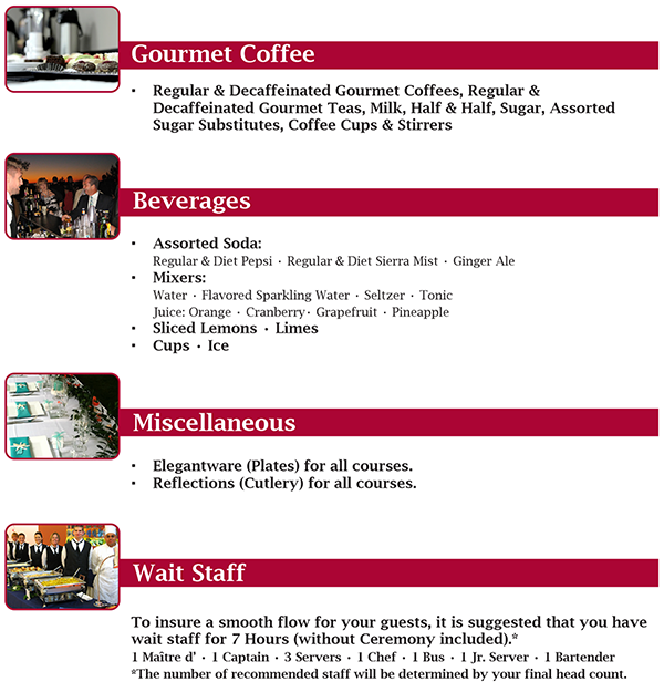 Visit our photo gallery to see pictures of our beach and backyard weddings, tent weddings in the parks and by the lakes, and see how we can transform the humblest of settings into a place worthy of a grand event. It doesn't matter if it is a theme wedding, a football wedding, an intimate gathering for closest friends or a grand event involving hundreds of people, we are conscious of your budget as well as any dietary restrictions you may have. We also offer a full gluten free menu from hors o'deuvres to a custom made wedding cake, provided by Pink Poppy gluten free and wheat free product line. Beyond catering exceptional food, we'll take care of all the little details from wedding equipment rental and party setup providing you with wedding tents, tables, linens, flatware, glassware, portable bathrooms, and everything else you might need to make your night a success.